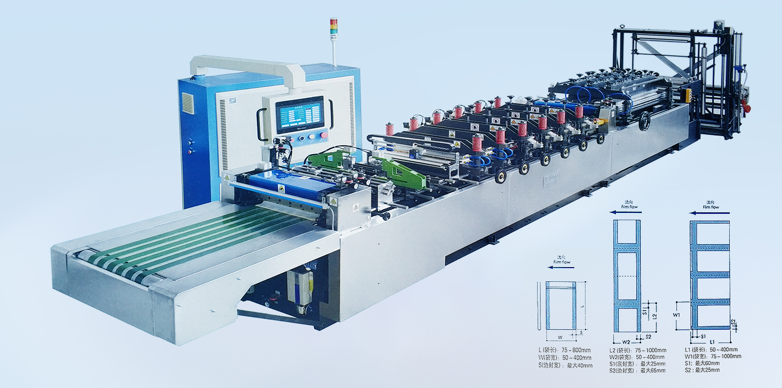 材料:各種復合薄膜。 卷筒:寬度≤1200mm,直徑≤800mm。 制袋速度:180段/分(機械設計速度)約<40m/min。 制袋寬度:≤500mm。 制袋長度:50-400mm,制袋長度超過400mm 以上應采用倍送功能。